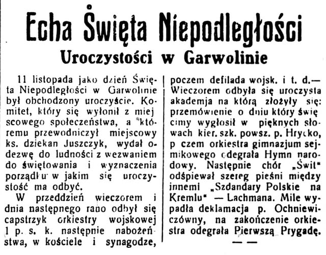Echa Święta Niepodległości Znaleźliśmy opis obchodów 11 listopada w Garwolinie w 1931 r. Opis prawie standardowy, ale naszą uwagę… 1931, Gazeta, niepodległość, odzyskanie niepodległości