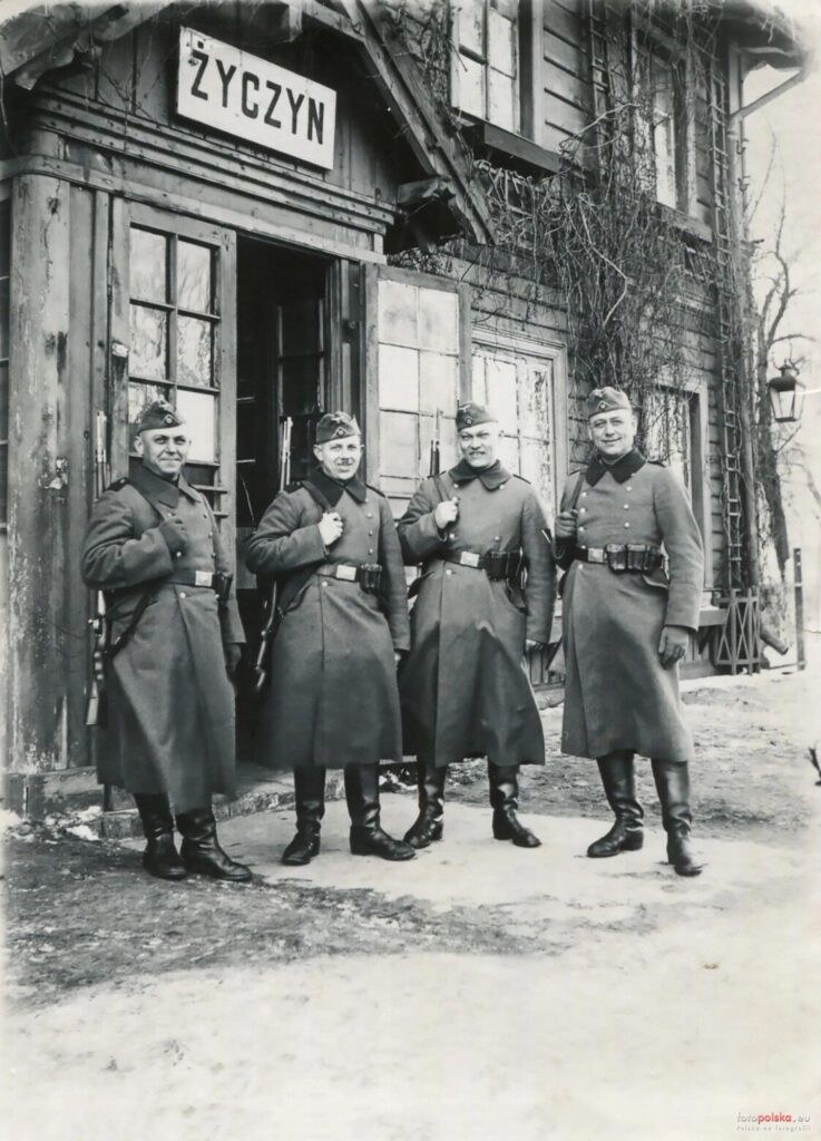 Dworzec kolejowy w Życzynie gm. Trojanów w czasie okupacji niemieckiej! Czterech żołnierzy Niemieckich postanowiło się sfotografować przed głównym wejściem do budynku.