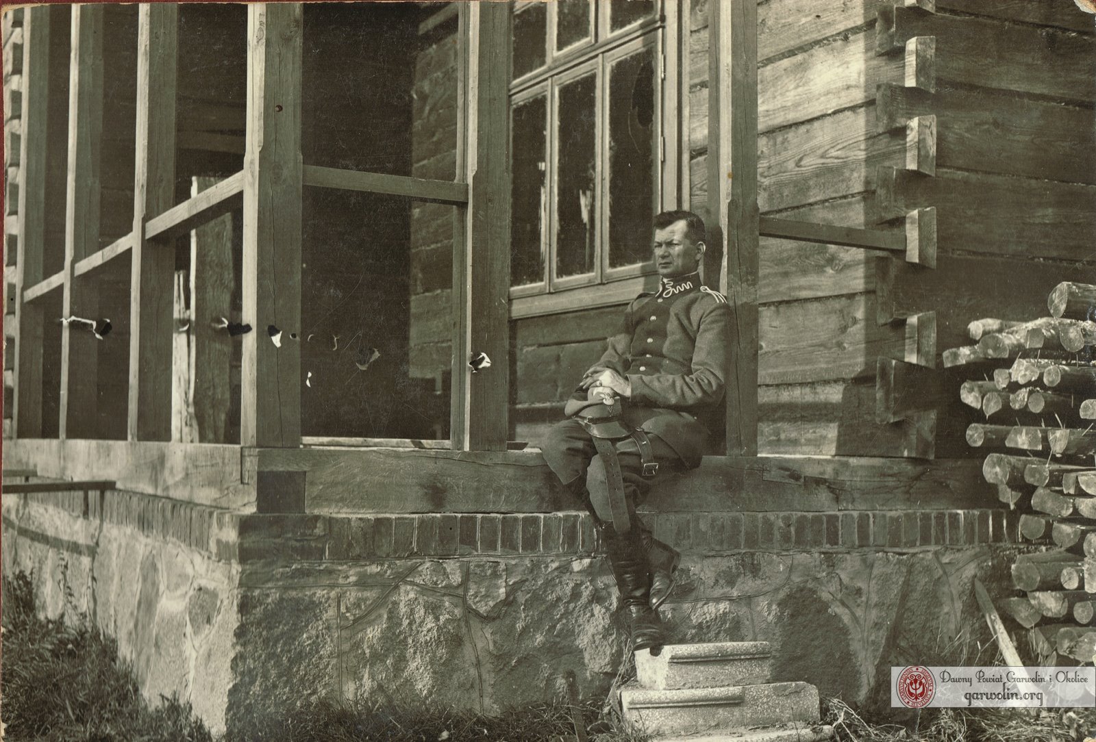 Na fotografii widzimy st. wach. Henryka Andrzejkowicza (1897-1944), oficera i fotografa w 1. Pułku Strzelców Konnych. Fotografię wykonano na ganku przy jego własnym domu na Kol. Henryków w Garwolinie. W domu tym mieścił się również zakład fotograficzny. Henryk Andrzejkowicz został podczas okupacji aresztowany przez Niemców. 25 sierpnia 1943 przewieziony do KL Auschwitz – Birkenau. Tam zostaje zamordowany 3 stycznia 1944 r.