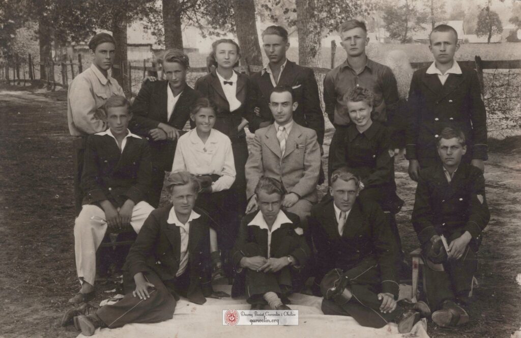 Fotografia przedstawia grupę uczniów z nauczycielem z Gimnazjum Koedukacyjnego w Garwolinie. Skąd to wiemy? Na tarczach mają numer 512 – a wiemy że nasze Gimnazjum właśnie taki numer nosiło. Drugi od prawej stoi Włodzimierz Karczmarczyk, pozostali są niezidentyfikowani. Fotografia z drugiej połowy lat 30. XX wieku.