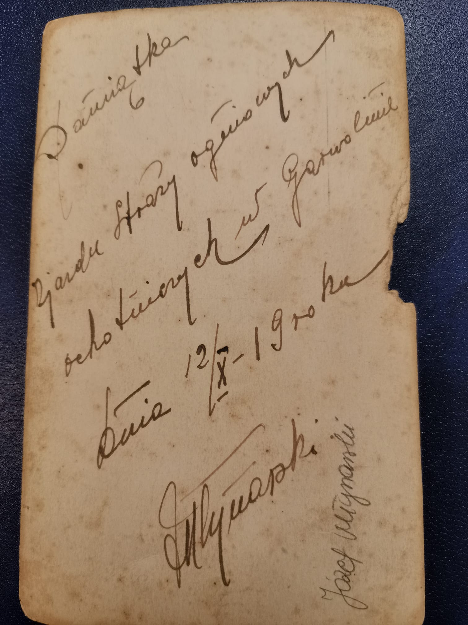 Zdjęcie grupowe – strażacy 1919 Na verso zapisek mojego pradziadka (Józef Młynarski – siedzi drugi od prawej): „Pamiątka zjazdu straży ogniowych ochotniczych w Garwolinie dnia 12 X 19 roku” Zjazd dotyczył chyba całego województwa, bo pradziadek był z okolic Powsina