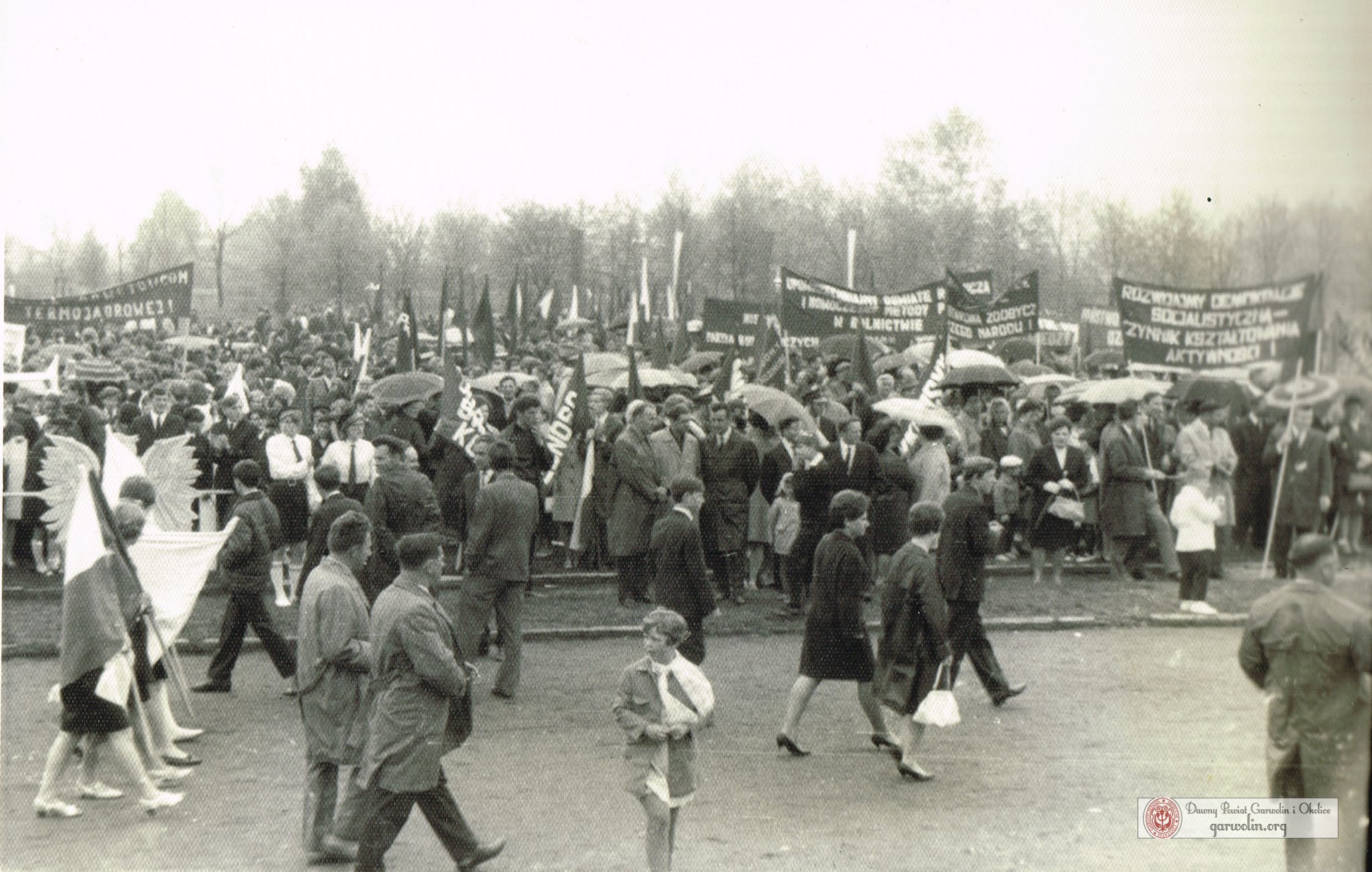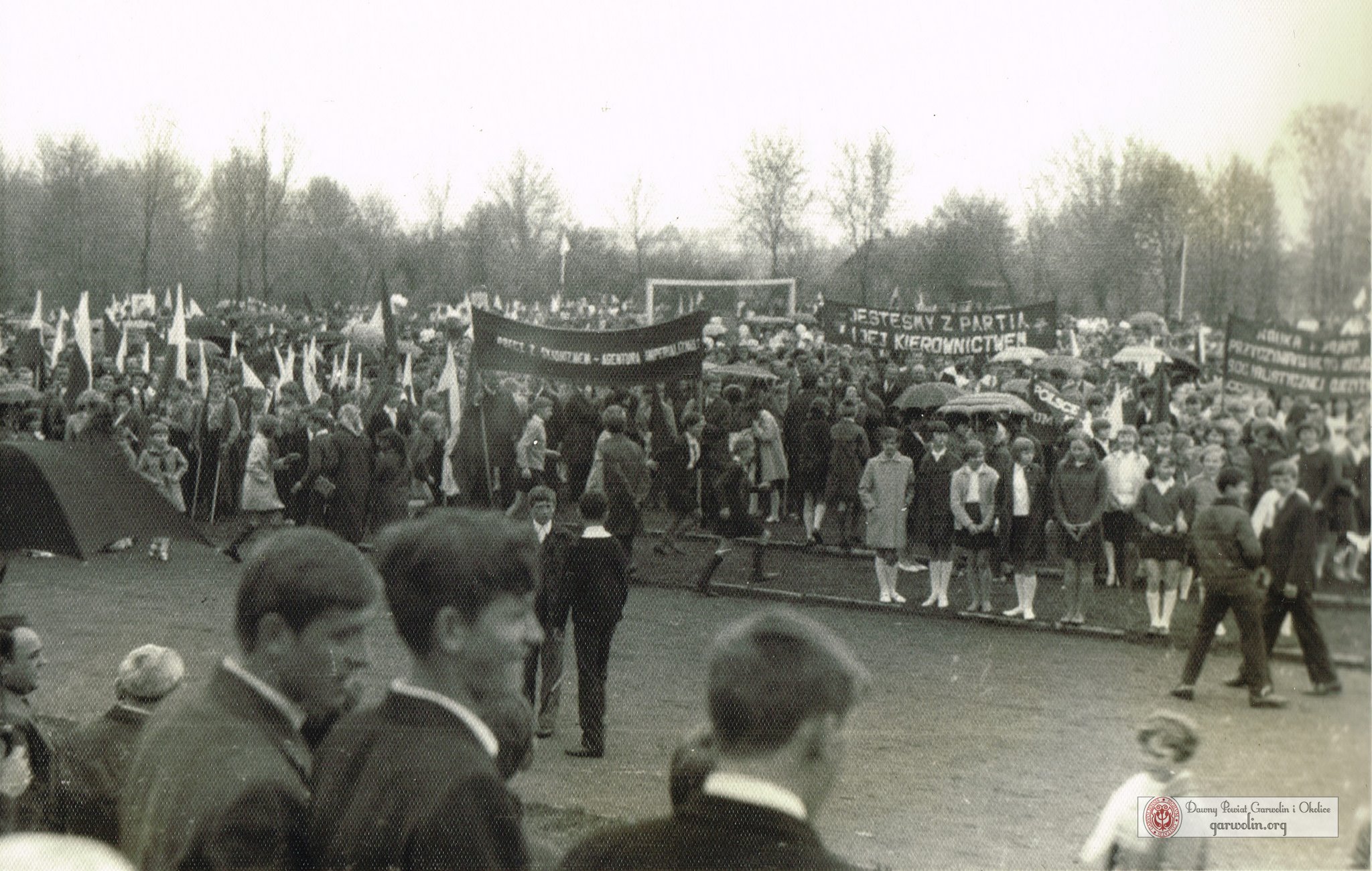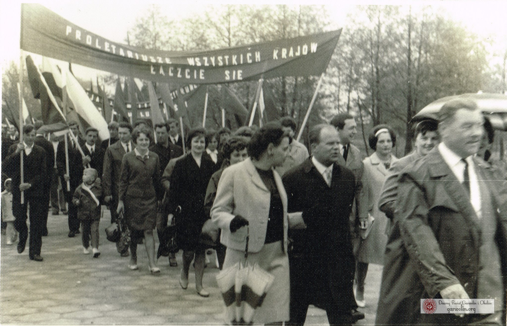 Załoga PKS Garwolin na pochodzie majowym 1 maja 1968 roku. Dalsza cześć uroczystości odbywała się na stadionie miejskim.1-majowe pochody były jednym z najważniejszych świąt w Polsce Ludowej. Były to oficjalne manifestacje, organizowane przez rządy komunistyczne, upamiętniające święto pracy i solidarności między pracownikami.