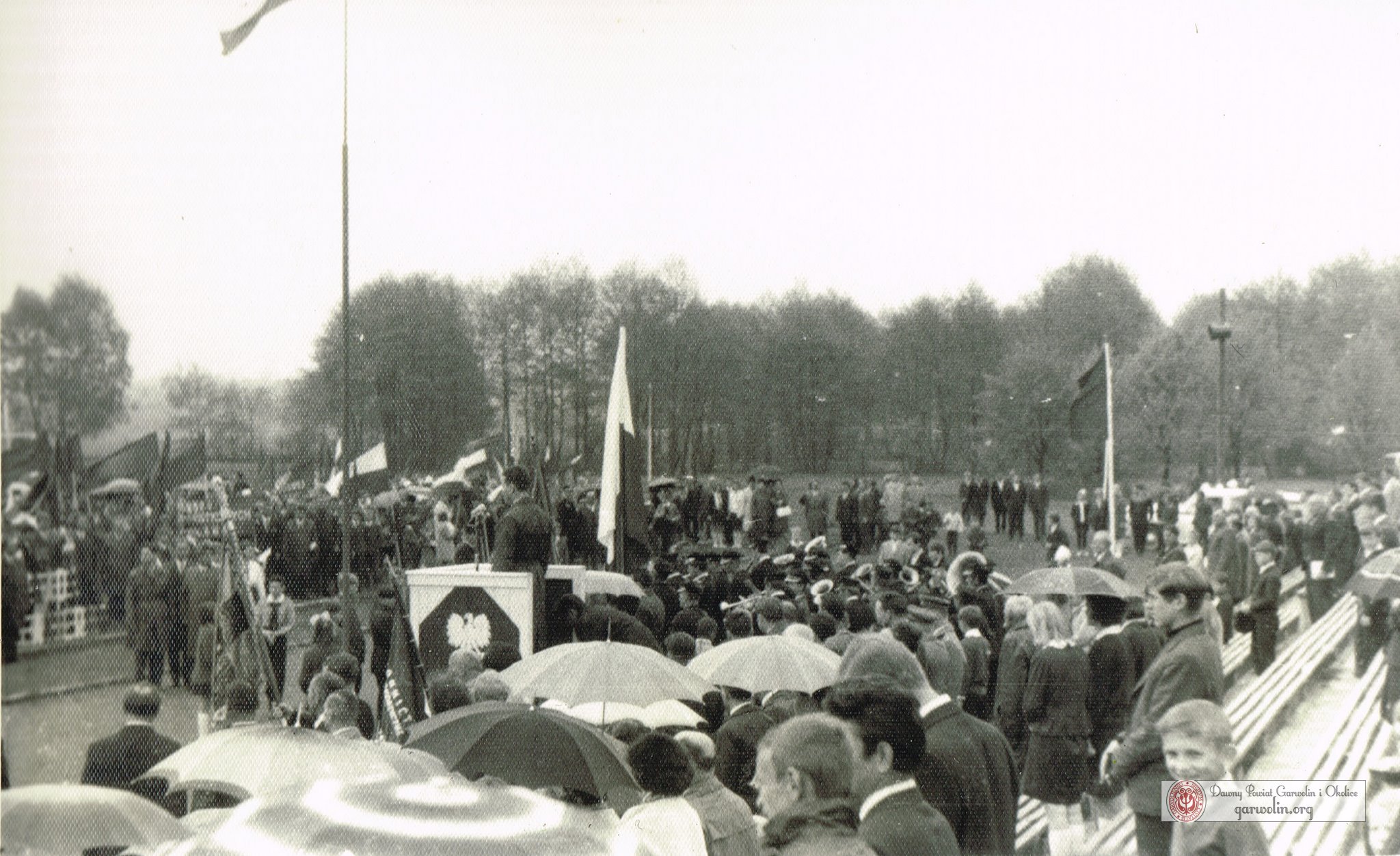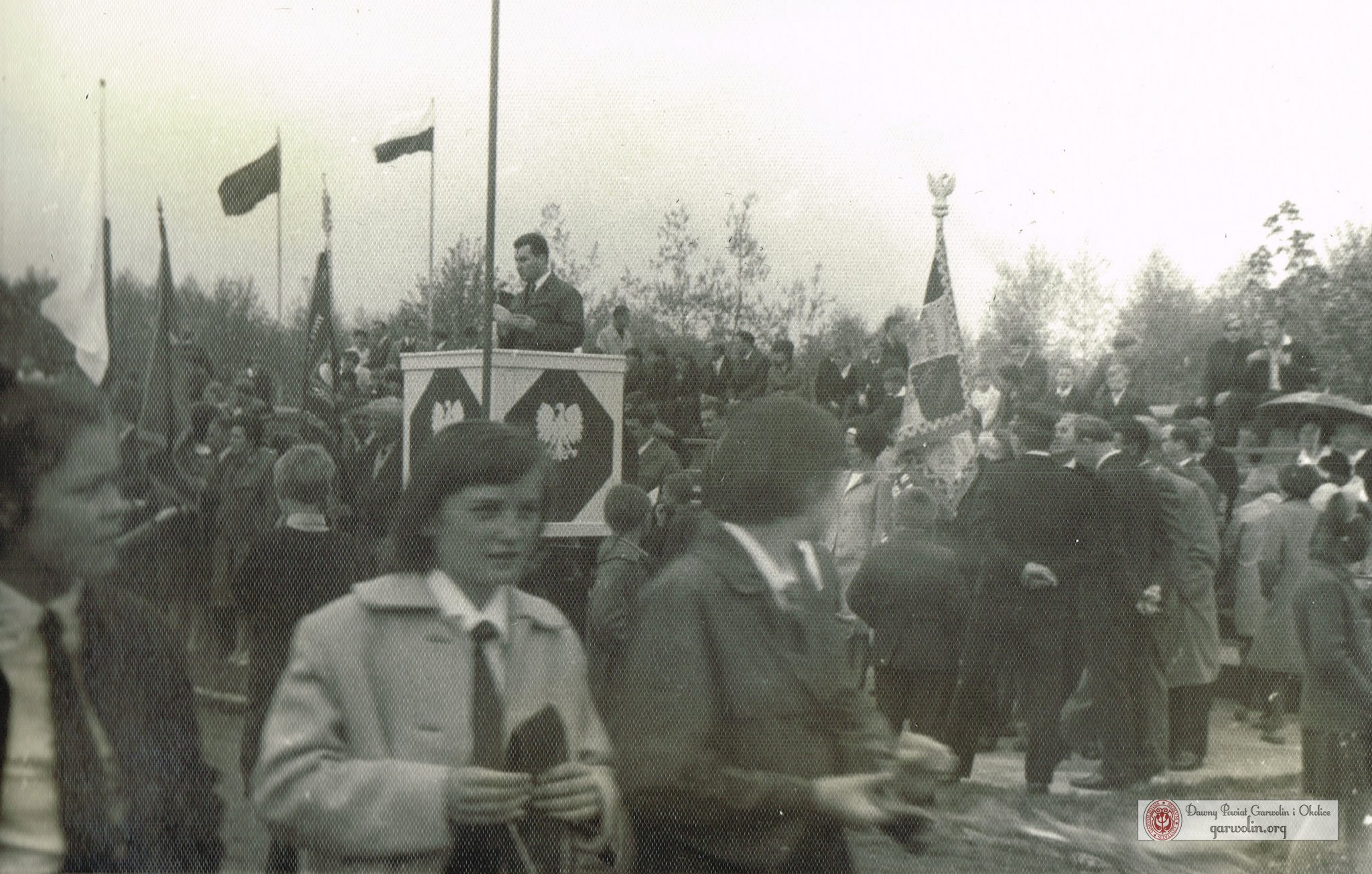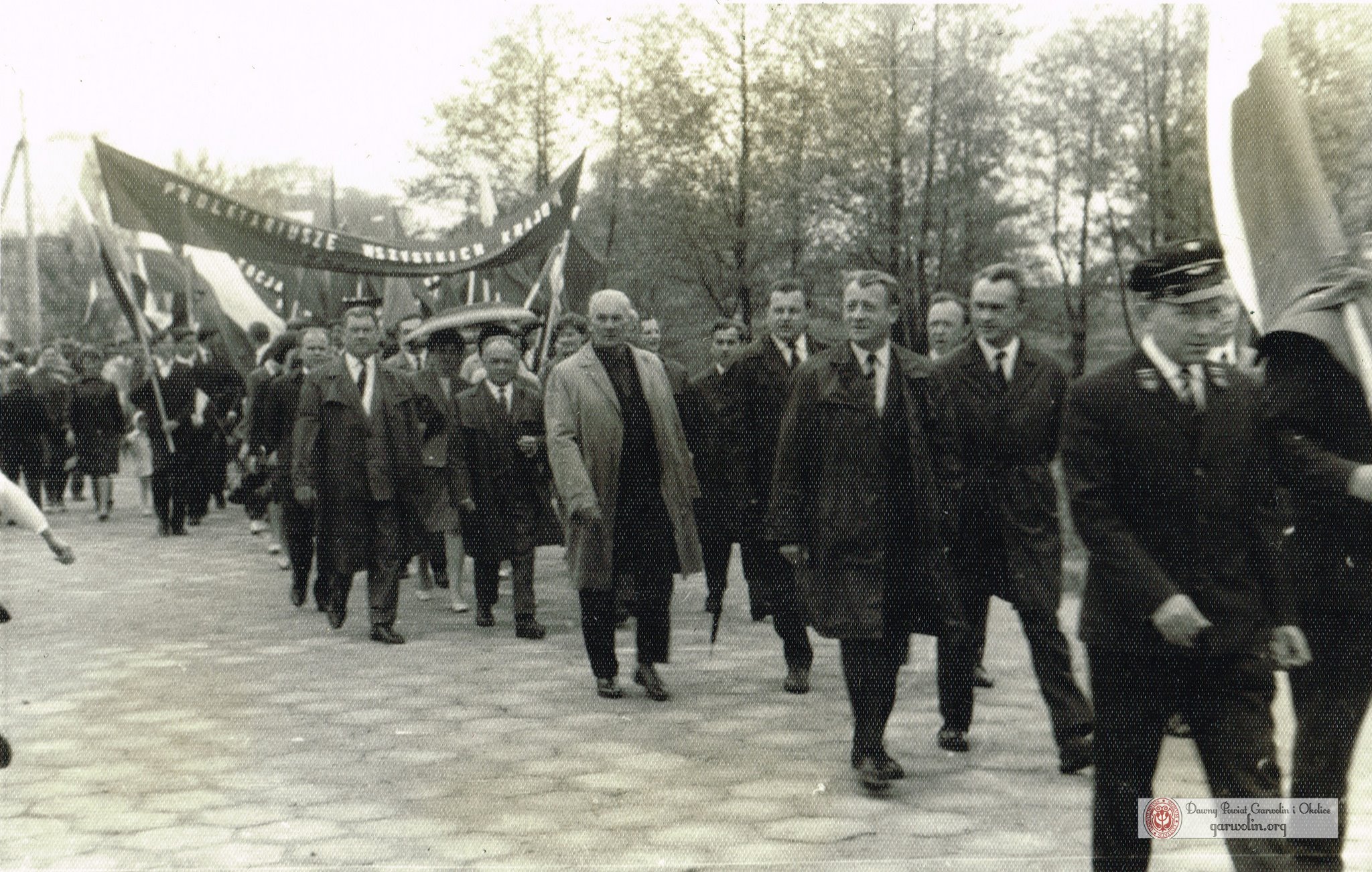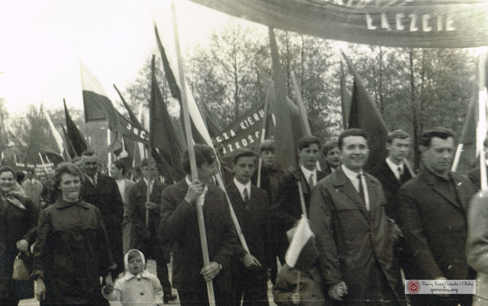Załoga PKS Garwolin na pochodzie majowym 1 maja 1968 roku. Dalsza cześć uroczystości odbywała się na stadionie miejskim.1-majowe pochody były jednym z najważniejszych świąt w Polsce Ludowej. Były to oficjalne manifestacje, organizowane przez rządy komunistyczne, upamiętniające święto pracy i solidarności między pracownikami.